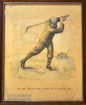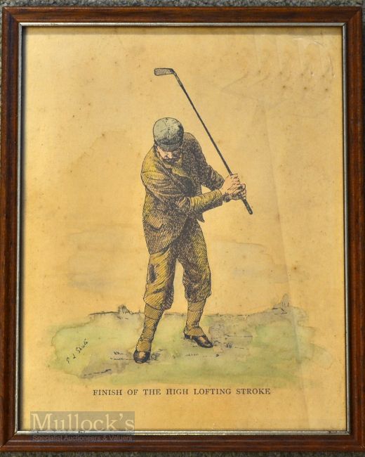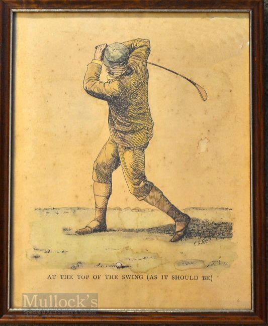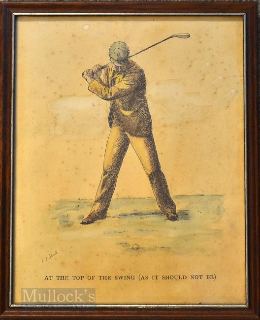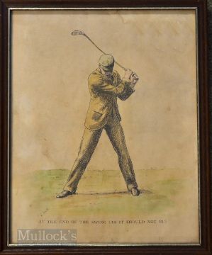 E L Shute collection of Vic. golfing coloured prints (6) all featuring an early Vic golfer playing various shots with longnose clubs and early irons “As It Should Be” and “As it Should Not Be” at the top of the swing and at the end of the swing plus the beginning of the high lofting stroke and finish of the high lofting stroke – some staining and foxing, all in matching frames overall 10.75 x 8.75” (AF)