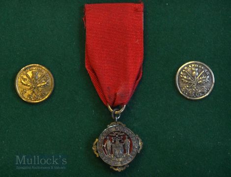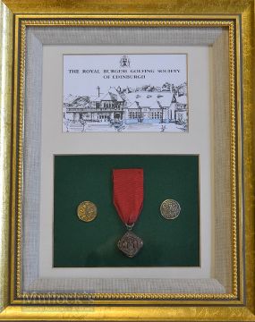 Display of Royal Burgess Golfing Society of Edinburgh (est 1735) Members Medal and Buttons (3) – to incl  members medal embossed on the obverse with the clubs crest and details to the border c/w red ribbon, together with 2x blazer buttons – together a picture of the club house – mf&g overall 14 x 11.5”. Note: The Royal Burgess Golfing Society of Edinburgh traces its origins back to 1735 and is widely recognised as the oldest golf club in the world. Note From The David Easby Estate