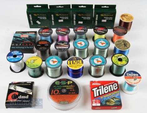 11x Spools of Braid from 8lb to 50lb, one spool part used with 8 spools of monofilament 2lb to 10lb, unused, and 7 spools 8lb to 25lb part used (26)