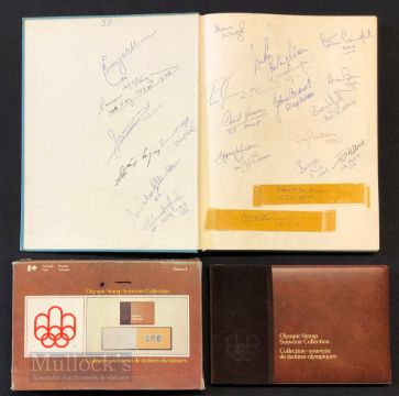 Multi-Signed Book ‘The Physique of The Olympic Athlete’ 1964 – signed comprehensively internally featuring David Hemery, Precious McKenzie, Mary Peters various Danish and Kenyan athletes plus USA Basketball team, most signed to the book, some cutting laid internally, approx. 50x signatures in total – by J M Tanner, pub’ London: George Allen and Unwin Ltd, appears in good condition overall, together with Olympic Stamp Souvenir Collection album with box (2)