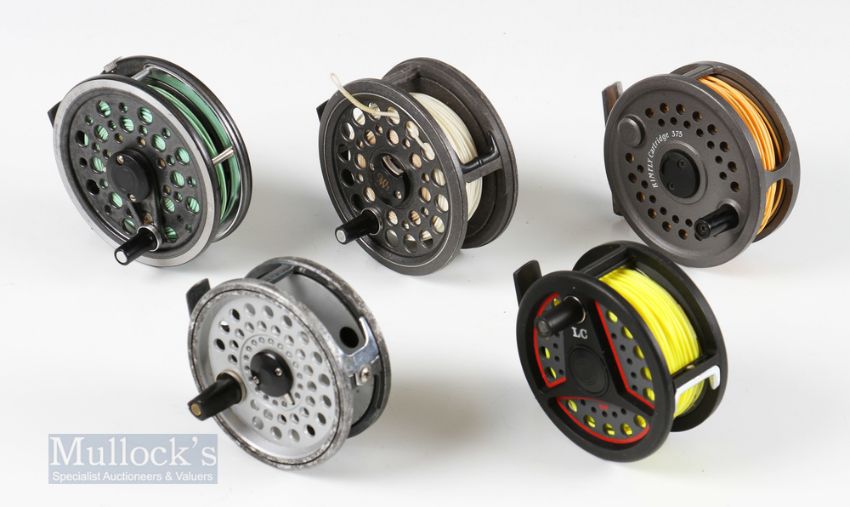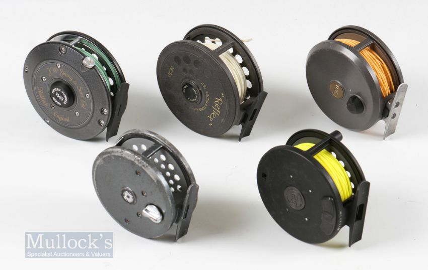 5x Reel Selection – J W Young 1505 series Gearfly 3 ½” with rim tensioner, 1450 Reflex 3 ½”, Leeda LC80 3 ¼” and Rimfly 375 3 3/8” with a Daiwa 3” fly reel, all run smooth with signs of wear (5)
