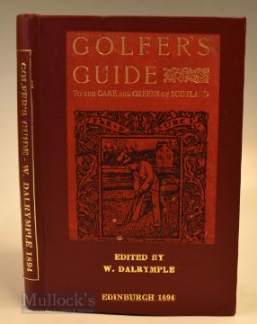 Dalrymple, W (ed) – “Golfers Guide to the Game and Greens of Scotland” 1st ed 1894 publ’d W H White & Co Edinburgh – rebound in leather with original red and gilt pictorial golfing scene laid down, illustrated with plans and photographs, large folding map, 208 pages plus 11 pages of ads at front and rear – but has fire damage to the bottom of the pages next to the binding which diminishes gradually onwards – all the illustrations and plans are complete – nevertheless A/F. Note It includes profiles of many of the era’s leading players to incl "Old Tom" and "Young Tom", Allan Robertson, John Gourlay, Willie Fernie, Willie Park Snr and Jnr et al. The second part of the book describes the greens of Scotland, many illustrated with plans.Note From The David Easby Estate