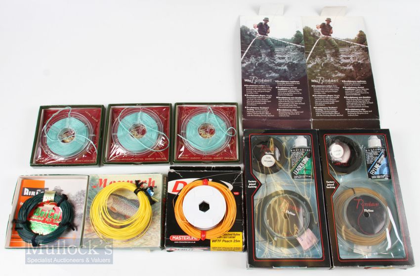 8x Mixed Fly Lines all appear unused in boxes, incl 3x The Mallard unsinkable line, Revolution Fly Line System DT6F float line and WF85 medium sinking, Scientific Anglers fast sinking, Monarch of the Glen WF6F and Masterline Debut Backing attached WF7F floating line (8)
