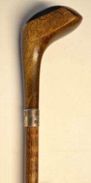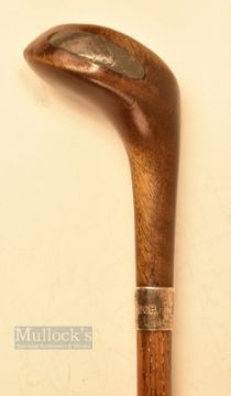 Early Sunday Golf Walking Stick -fitted an attractive small wooden driver head with black fibre sole insert and rear lead weight, and a silver neck band hallmarked and engraved with golfing figure and Lena Inch – and c/w brass tip overall 33.5”