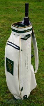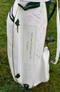 Interesting Old Course and Country Club St Andrews profusely signed golf bag – incredible collection of 26x Major and PGA Tour Winners signatures comes complete with list – notably Arnold Palmer, Payne Stewart, Seve Ballesteros, Tom Kite, Ben Crenshaw, Larry Nelson, Johnny Miller, Hal Sutton, David Graham, Isao Aoki, Hubert Green, Andy Bean, Bill Rogers, Ray Floyd, Tom Watson, Greg Norman, Bernard Langer, Hale Irwin, Fred Couples, et al. Note From The David Easby Estate