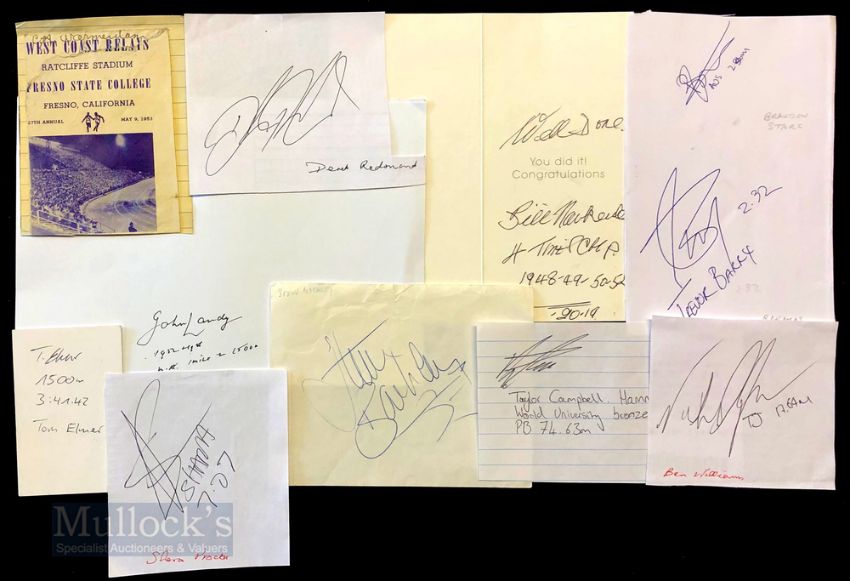Mixed Selection of International Athletic Autographs featuring Steve Backley (javelin), Derek Redmand, (400m), Taylor Campbell (hammer), Ben Williams (triple jump), Shara Proctor (long jump), John Landy (1 Mile), Brandon Starc (high jump), Hans Baumgartner (long jump), Tom Elmer (1500m), and Bill Nankeville (mile/1500m), all on various pieces of paper, various sizes etc (9)