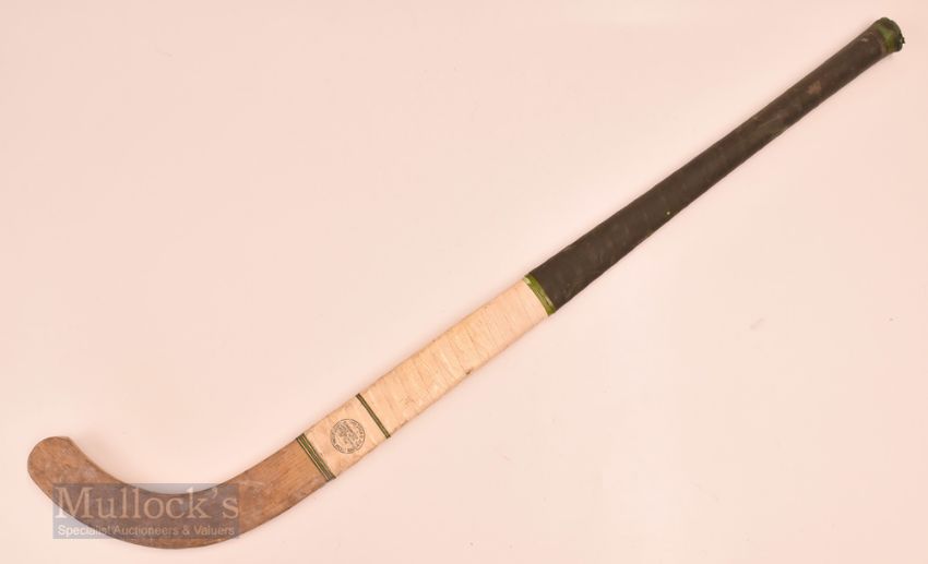 Slazenger Flick wooden hockey stick stamped ‘18’, with a ‘Lesley Shanly’ metal plaque, appears with signs of age related wear