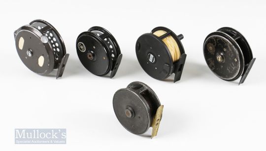 5x Assorted Reels – Edgar Sealey Flyman 2 ¾” reel in white with constant check, Leeda LC80 fly reel, Intrepid Gearfly 3 ½” reel, Allcock’s The Gilmour 2 3/8” and another unnamed 3” brass foot fly reel, all run smooth with wear (5)