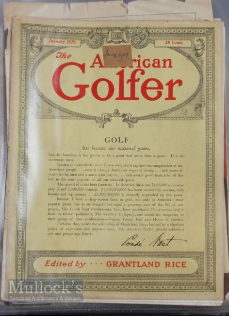 1929 The American Golfer Monthly Magazine – editor Grantland Rice (11/12) – first edition under the new ownership of Conde Nast Publication – all retain their front and back covers albeit loose and incomplete hence all (A/F) – presumably certain articles have been removed but still retaining good information, illustrations and advertisements especially Walter Hagen Clubs still producing hickory shafted sets - 11 out of 12 issues missing only September month. Note From The David Easby Estate