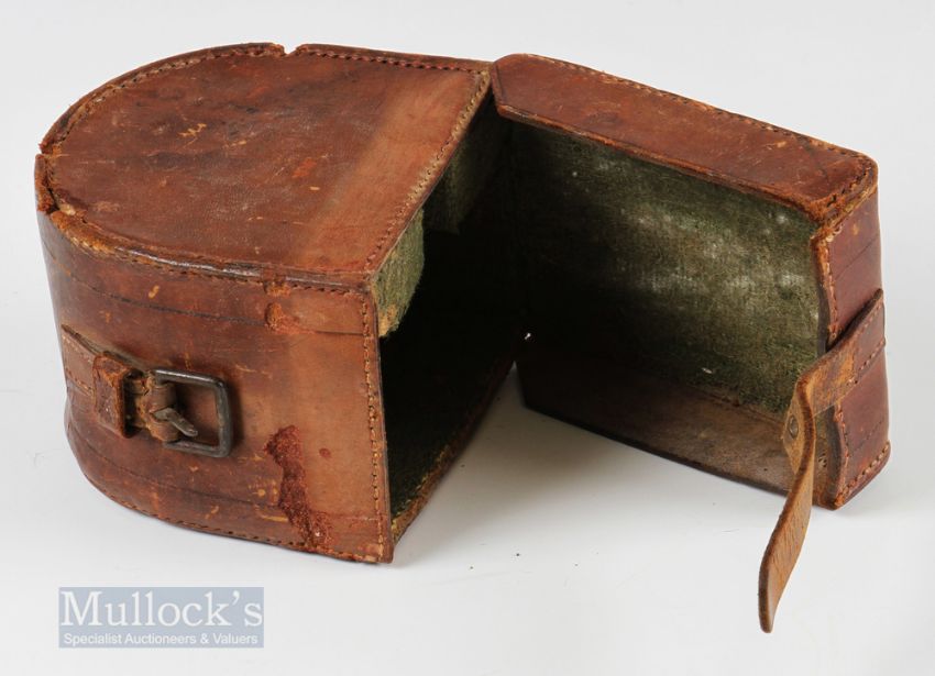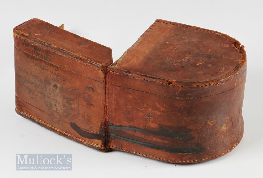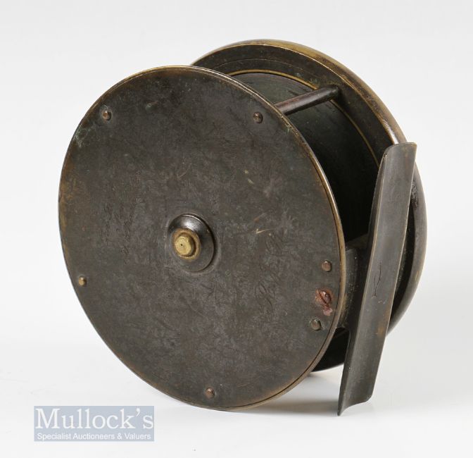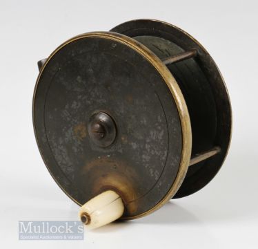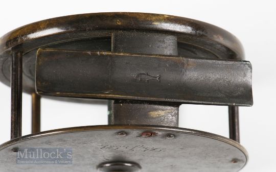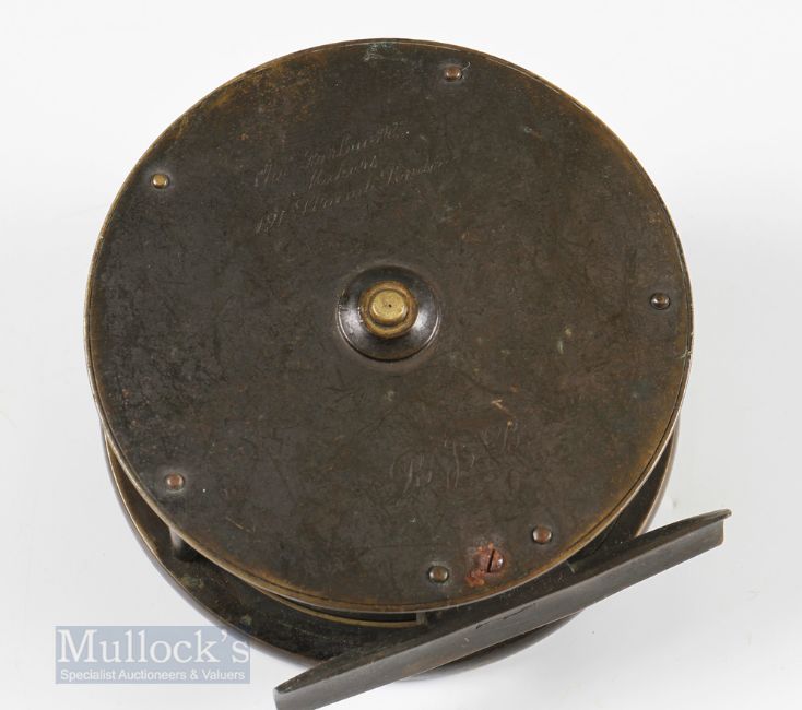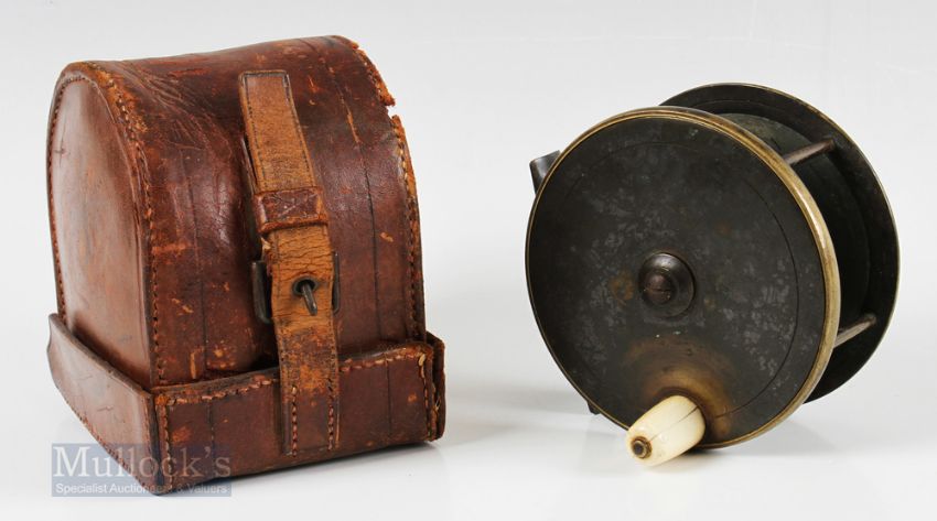 Chas Farlow & Co, 191 Strand London 4 ¼” All Brass Reel with Block Case with white handle and smooth check, smooth brass foot with fish logo, initials RJB to rear plate, shows overall signs of wear, runs smooth, in unnamed block leather case, overall wear and minor losses with faint writing to lid and one side