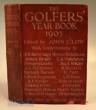 Low, John L (ed) – rare The Golfer’s Year Book 1905 – Vol.1 publ’d by James Nisbet & Co London – original red cloth and white printed boards (showing its age) 498p, plus advertisements to front and rear pages internally clean hence overall (F) Note Nisbet’s Golf Year Book was published from 1905 until 1914 providing an important source of information about clubs throughout the United Kingdom. The volumes also contain records of significant amateur and professional events as well as valuable “Who’s Who” listings of leading amateur and professional players-these volumes also contain Writings by some of the leading figures in the game including Harold Hilton, Willie Park Jr and Bernard Darwin. Note From The David Easby Estate