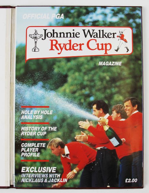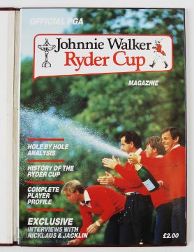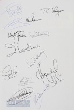 1987 Ryder Cup Great Britain and Europe Team Signed Presentation Programme in Leather Boards signed by the 12 players and captain of the Great Britain and Europe team; Tony Jacklin, Ian Woosnam, Nick Faldo, Howard Clark, Seve Ballesteros, Gordon Brand Jnr, Sam Torrance, Bernhard Langer, Jose Rivero, Eamonn Darcy, Jose Maria Olazabal, Sandy Lyle and Ken Brown. Provenance: This item has been consigned to sale from Gordon Brand Jnr’s family.