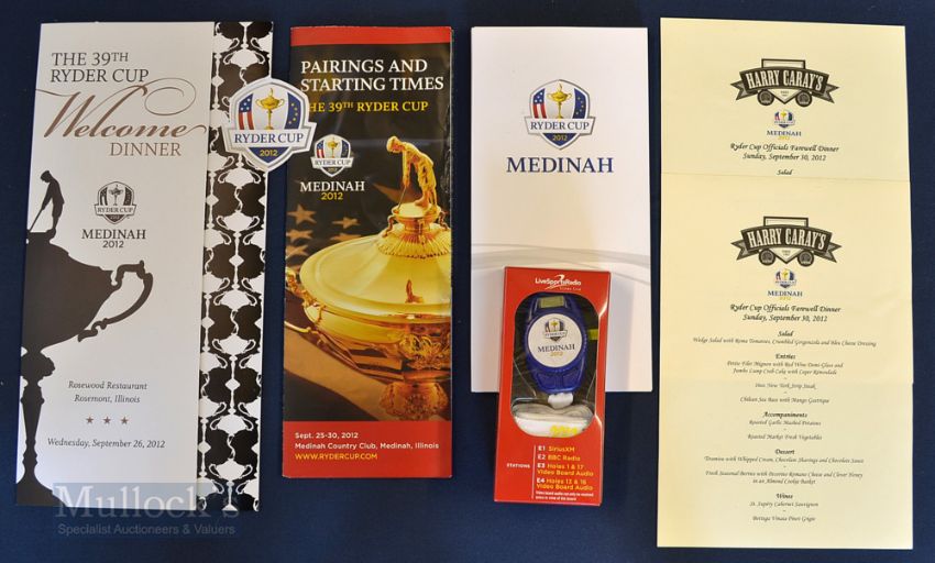 Collection of 2012 Official Ryder Cup Menus and Other related items of merchandise (7) – Welcome Dinner Menu, Spectator pack, Ladies Luncheon Menus, Pairings Starting Times for Sunday with results for the first two days ( pocket fold) and Ryder Cup Live Sports Radio in makers original packaging.