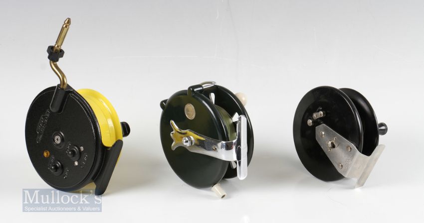 3x Centrepin Reels – Night Hawk 7003 double side casting reel with built in alarms, in original box appears unused, Paramount Credenda 5” reel with 2 white handle, line guard in green finish, and a Fuji VP35 4” twin handle reel (3)