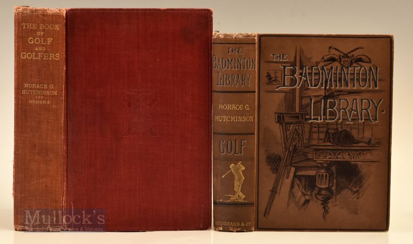Hutchinson, Horace G (2) - "Golf - Badminton Library" 1st ed 1890 in the original pictorial brown and decorative gilt cloth boards and spine (minor thumb wear to top and tail of spine) c/w numerous illustrations, slight hinge weakness to the inside front board, very slight discolouring spots internally otherwise overall (F/G); and “The Book of Golf and Golfers” Cheaper Ed 1900 publ’d Longmans Green & Co London New York Bombay, in the original red and gilt decorative cloth boards with original frontispiece plate showing Freddie Tait together with numerous other photographic illustrations throughout of the leading men and lady golfers of the day, slight bruising and scuffing to top and tail of spine) – discoloured front and rear free end plates - speckle foxing internally hence overall (F).