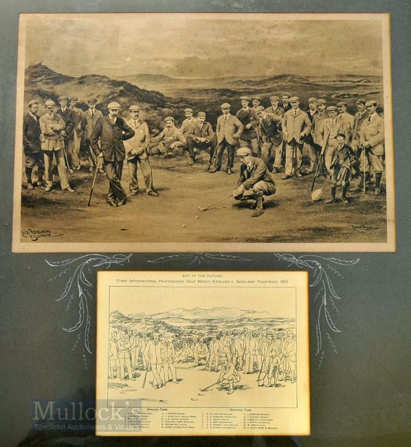 Michael Brown (1853-1947) after – 1904 Life Association of Scotland golfing lithograph print entitled “First International Professional Golf Match – England v Scotland – Prestwick 1903” featuring Vardon, Taylor, Braid, Herd, Sayers et al c/w the key to the picture mounted on the back board featuring all the players from both teams - decorative hand painted floral mount c/w the original key and gilt slips – overall 24 x 23” - some tiny speckle foxing to the sky. Note this and the following print were acquired by the vendor’s company when they bought the Penfold Company all of which adorned the Directors Boardroom.