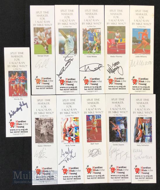 Selection of Athletics and Other Sports Autographs featuring Wendy Sly, Kelly Sotherton, Goldie Sayers, Steff Twell, Andy Turner, Walter Wilkinson, Jodie Williams, Martyn Rooney, plus Victor Moses (football), Alec Stewart (cricket), and George Chuter (rugby) all inscribed to bookmarks, in ink and appear clear signatures below print depicting the athlete (11)