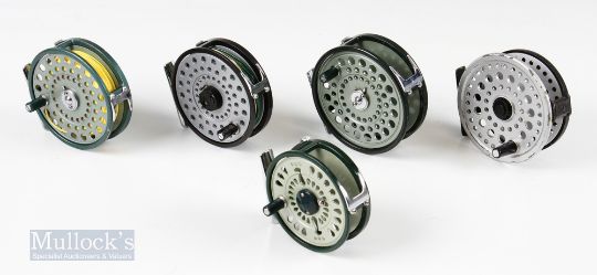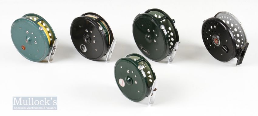 Japan Made Fly Reel Selection (5) – Olympic 4310 3 1/8” and 4340 3 ¾” reel with rim tensioner, Kassnar FL-0461 3 3/8”, Roddy 32 with rim tensioner, Ryobi 357MG Superlight magnesium 3 ½”, all showing light use (5)