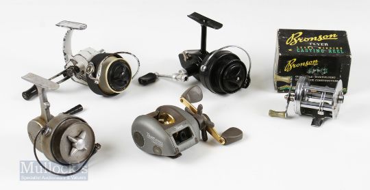 5x Mixed Fixed Spool Reels – Bronson Flyer no.2450 in original box, Banex Tova 300L, Allcock’s Delmatic Mk2, Brevete, France Model Depose reel and Cigno reel, all run smooth, most appear used