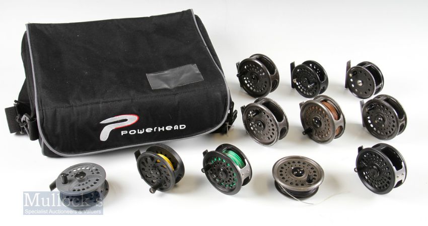 Powerhead Reel Case and Mixed Reel Selection containing 10 fly reels incl Marado, Fladen, Intrepid and others plus a spare spool, all in used condition