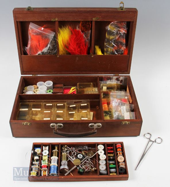 Fly Tying Case and Contents incl silks inc Pearsall’s and Sunrise, Glowbright, large selection of salmon double flies, wires and tinsel, mixed selection of tools, set of gallows, no vice