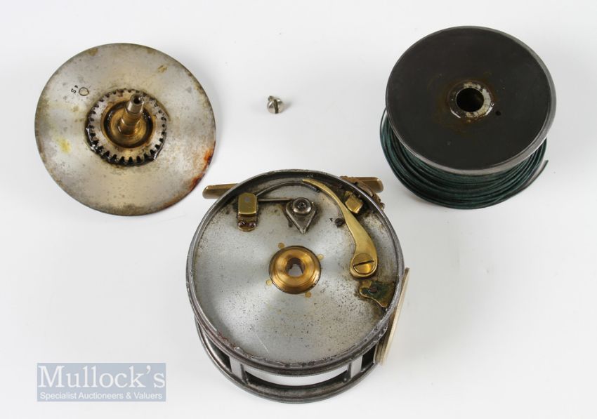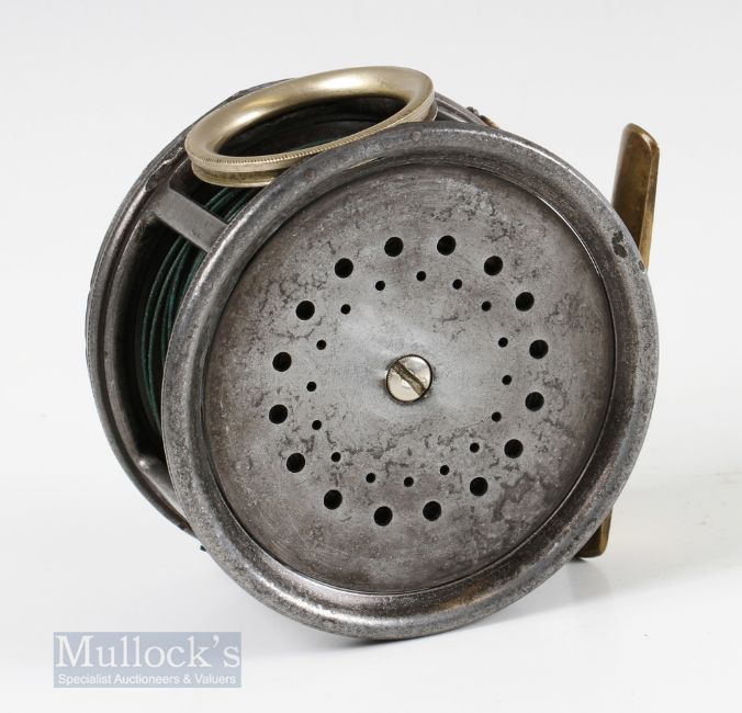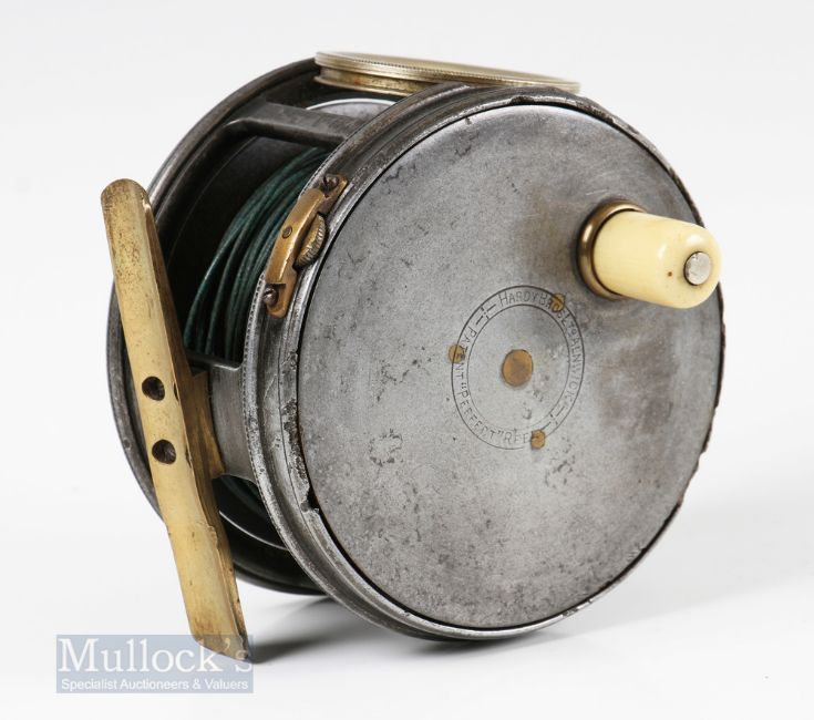 Scarce Hardy Perfect 4 ¼” Wide Drum 1912 Check Eunuch Salmon Fly Reel with rotating line guide with factory white handle, brass foot having a slight kink to one end, frame having some corrosion and losses to rim, but doesn’t affect the working of the reel, rotating line guide moves freely.