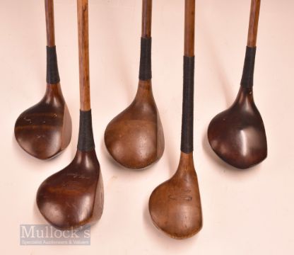 5x good size assorted socket and scare head woods from drivers to spoons – J Youds Hoylake Defiance driver, Melville Brown Malone GC scare neck brassie, Charles striped topped spoon, a large head dark stained persimmon wood with a sole plate stamped Brassie and another dark stained shallow face spoon with diamond cut face markings – all with good grips and very playable