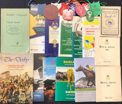 Assorted Horse Racing Programmes and Card Enclosure Badge Tags featuring tags Kempton Races, Ascot Races, Sandown Park, Cheltenham 2007 (x13), plus 1936 Sandown Park Aug 3rd, Royal Ascot 1962, 1964, , Lester: A Biography Book SB, and The Derby Book 1979 Book HB with DJ, plus other modern programmes (#25)