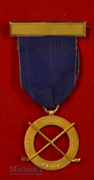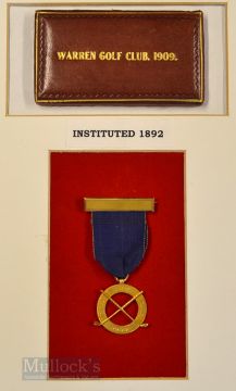 1909 Warren Golf Club (Inst 1892) 15ct Gold Medal – c/w blue ribbon and yellow bar – made by Vaughton & Son – in glass display case mounted with makers leather and gilt lid – overall 14 x 10.5”. Note From The David Easby Estate
