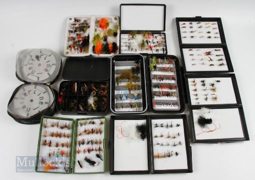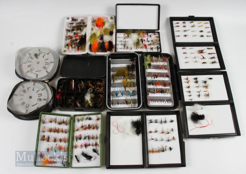 8x Fly Boxes and Flies containing 250+ wet and dry trout flies, housed in 1x C&F large box, 3x Derwent style boxes and 3 others, with a Masterline cast carier with spools