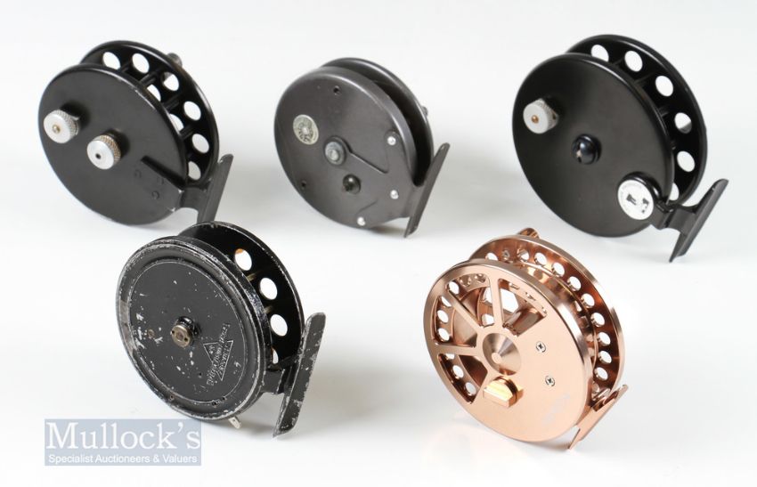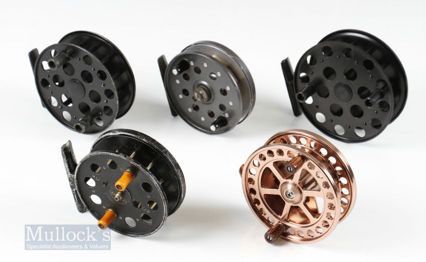 Centrepin Reel Selection (5) – 2x Lewtham Products “The Leeds” reels 4 ¼” and 4 ¾”, both with twin handles and rear tension adjusters, Waterline Angling Ikonix 4 ¼” gold finish reel with twin wooden handles with original box, appears unused, Speedia 4” twin handled reel and Strike Right Ultraflo 4” twin handled reel (5)