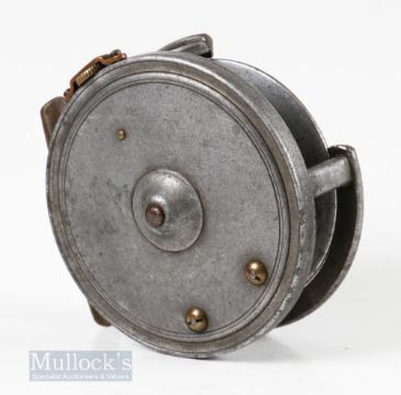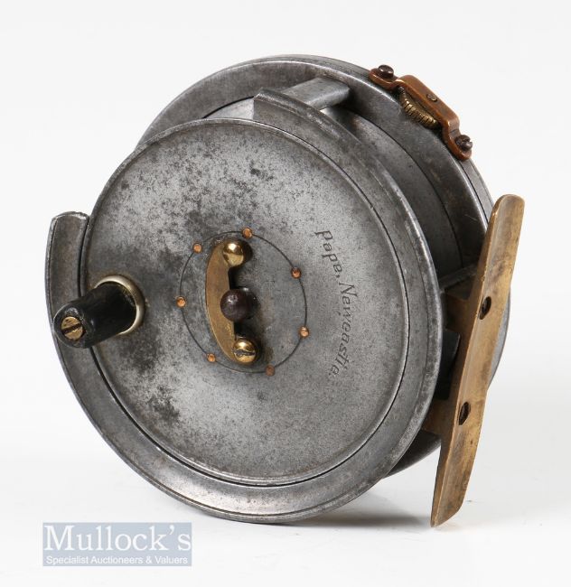 Pape Newcastle 3 ¼” alloy fly reel with telephone latch, stamped 3 internally, pillar drum core, no D stamp mark apparent, appears with quarter rim cut out (not factory), strapped rim tensioner, constant check, line wear and slight chips to rim, surface wear, appears to run smooth otherwise, ideal for spares