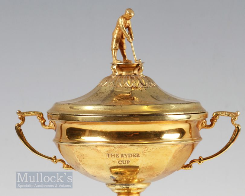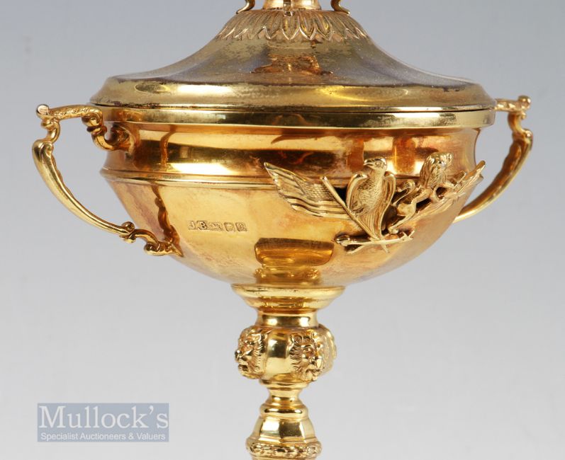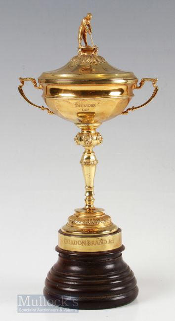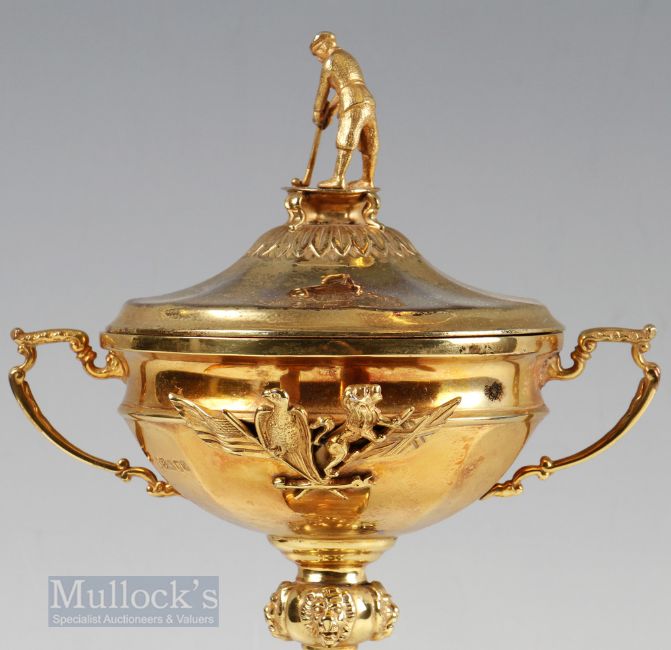 1989 Players Ryder Cup Silver-Gilt Trophy Awarded to Gordon Brand Jnr the cover having a standing cast golfer figure, the twin handled cup having lion mask knop stem, all on wooden base with an engraved silver band ‘Gordon Brand Jnr The Belfry 1989”, height 31cm, hallmarked London 1990. 1989 was the second and last appearance for Gordon Brand Jnr at the Ryder Cup and was retained by the Europe team by tying the match 14 all. Provenance: This item has been consigned to sale from Gordon Brand Jnr’s family.