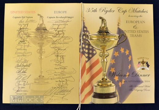 Rare 2004 Ryder Cup Fully Signed Welcome Dinner Menu – played at Oakland Hills Michigan with Europe winning by the largest margin ever on USA soil - signed by both captains – USA include Tiger Woods, Phil Mickleson, Davis Love III, Jim Furyk, Kenny Perry, David Toms, Chad Campbell, Chris DiMArco, Fred Funk, Chris Riley, Jay Haas and Stewart Cink – Europe incl Bernhard Langer , Padraig Harrington Sergio Garcia, Darren Clark, Miguel Jimenez, Lee Westwood, Thomas Levet, Paul Casey, David Howell, Paul McGinley, Colin Montgomery and Luke Donald – c/w letter of provenance from PGA (VG). Note These individual Dinner Menus are from a strictly and exclusive limited edition only distributed post-match between both Teams, their Official Parties and Corporate Partners