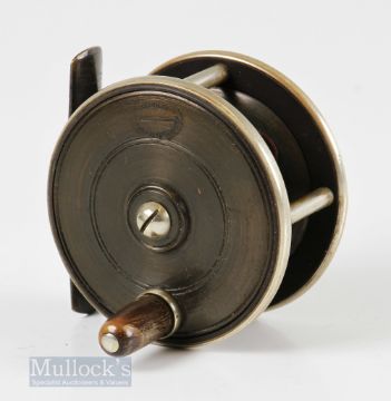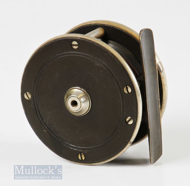 J Forrest of Oxford 2 ½” brass and ebonite trout reel with oval maker’s details to backplate, nickel rims, brass foot, good constant check, appears in good condition overall