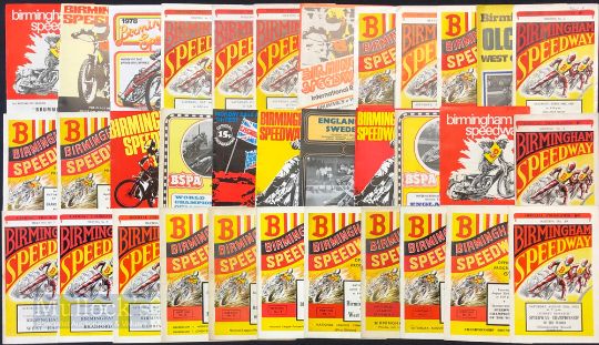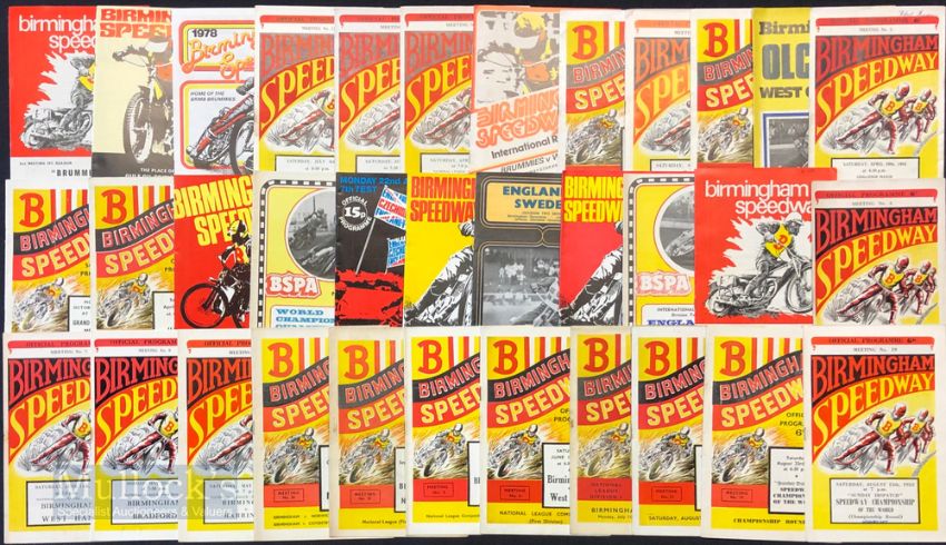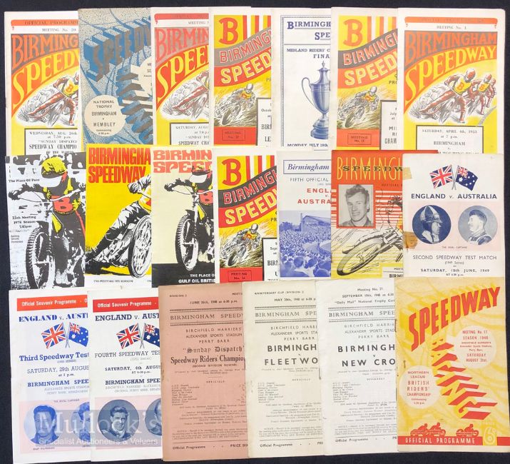 1946 to 1970s Speedway Programmes at Birmingham featuring 46 v Wembley, 46 Northern League British Riders Championship, 48 Speedway Rider Championship, 48 v Fleetwood, 49 England v Australia, 51 England v Australia, 53 England v Australia, 55 England v Australasia, 48 v New Cross, 54 Midland Riders Championship Final, 52 Midland Riders Championship, 53 v Swedish Touring Team, 51 v USA, 49 Speedway Championship of the World plus others, condition mixed A/G overall (#45)
