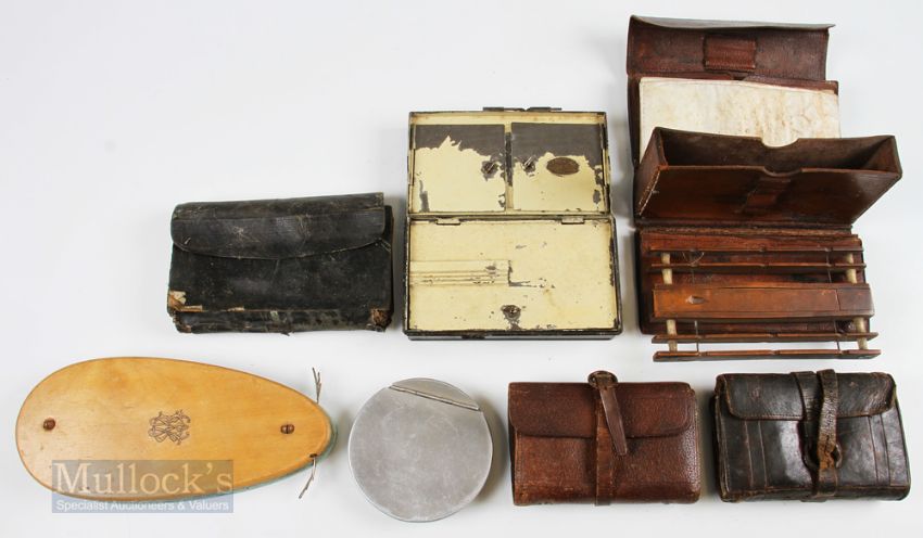 Collection of tackle boxes and wallets 7 to include Japanned 6 ½” x 4” tackle box by Bambridge of Eton on Thames an early bound course fisherman’s wallet with central box holding a 4 section float/cast winder with bone spindles, a Wheatley cast box with dampers , 3 leather fly/cast wallets to include an example by Bowness of London and an unusual 20th century French wood and alloy cast/holder tackle container