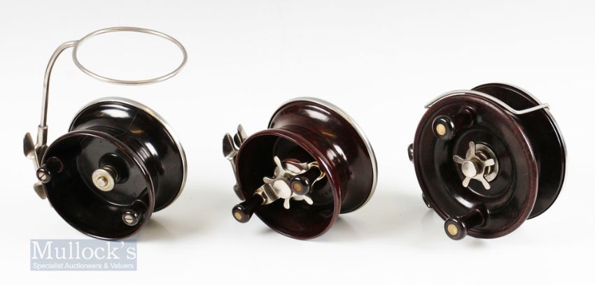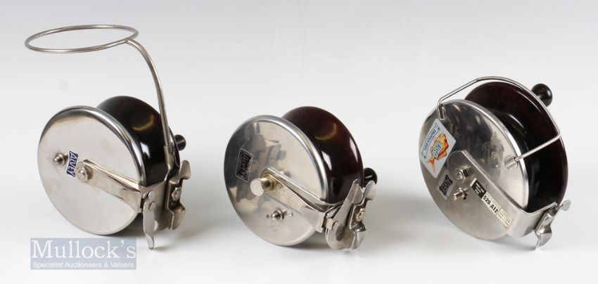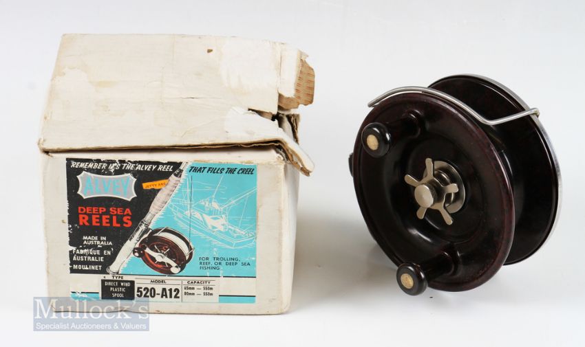 3x Alvey Australia Sea Reels – 520-A12 5 ¼” deep sea snapper reel with twin handle in original box, check needs attention, 4 ¼” side caster deep sea reel with light use and 450/A1 4 ¼” side caster deep sea reel with light use, all RHW (3)