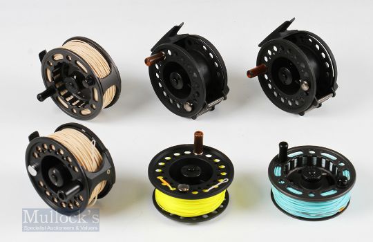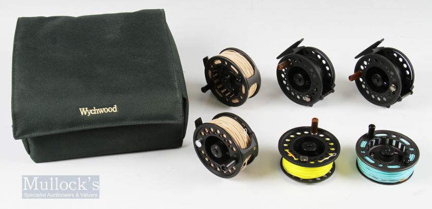 Reel and Spool Selection with Wychwood Case – LA Scorpion Economy composite 5/6/7# 3 3/8” fly reel and spare spool, Fishlogic 5/6# 3 3/8” reel, Fly 100 455 Geologic composite 3 3/8” reel, Wychwood Trufly alloy 5/6# 3 3/8” reel with spare spool, all in Wychwood 8 section padded reel case (7)