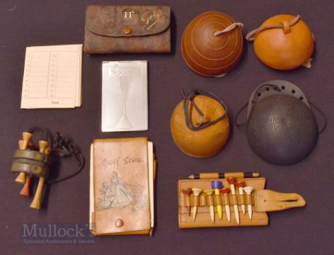 Selection of Golf Tees and Memorabilia featuring a Ball Cleaner, tee holder and score cards wallets, plastic, leather and wood examples.