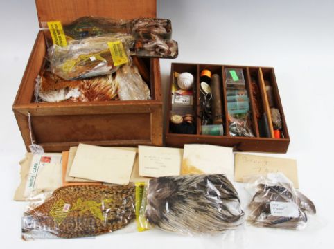 Home Made Fly Tying Chest with Contents incl silks, hooks, wire, good selection of feathers, priest etc, with tray, chest size 13” x 13” x 7”, with a brass pond ornament of a fisherman, missing rod (2)