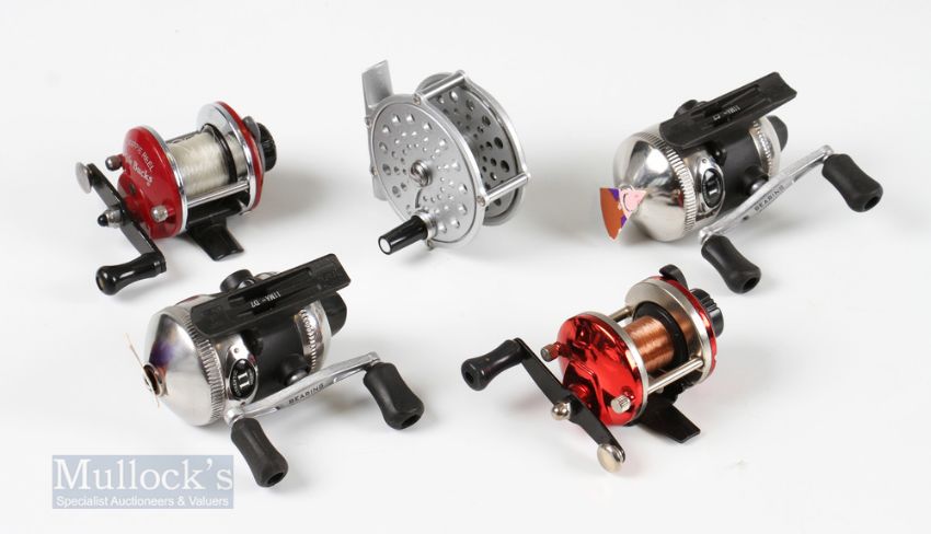 Reel Selection (5) – Uncle Buck’s Crappie multiplier UB20 reel, with a similar unnamed reel, Authentic II micro closed face reel with another unnamed similar and a 2 ½” Ratchet reel, appears unused (5)