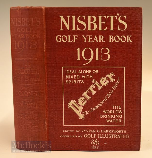 Nisbet’s Golf Year Book 1913 - Vol. 9 edited by Vyvyan G Harmsworth - published by James Nisbet & Co London - original red cloth and white printed boards (spine faded);illustrated plates to include John Ball, George Duncan, Jean Gassiat, Miss Cecil Leitch, Abe Mitchell, Edward Ray (Open Champion), J H Taylor, Harry Vardon et al together with maps showing the golf course Note From The David Easby Estates of Great Britain 17pp together with significant report on all professional and amateur events as well as listings of all leading amateur and professional players - clean internally hence overall (G)