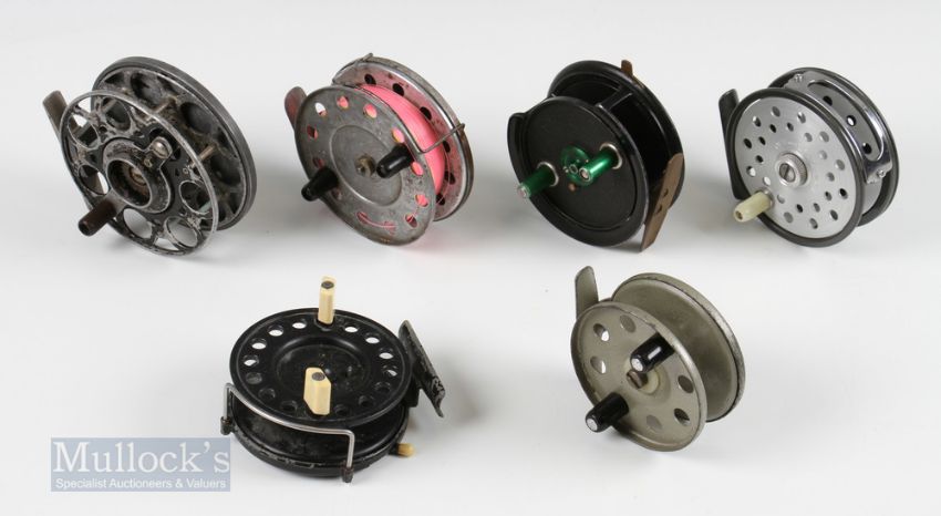 6x Assorted Centrepin Fishing Reels – KP Morritt’s New Popular 3 ¼” reel with twin white handle, Strike Right 3” reel, Sun Eaton alloy 3 ½” reel, The Competition 3” fly reel, lever a/f, Mercury 3 ¾” reel and an unnamed Japan made 3 ½” reel with moveable line guard (6)