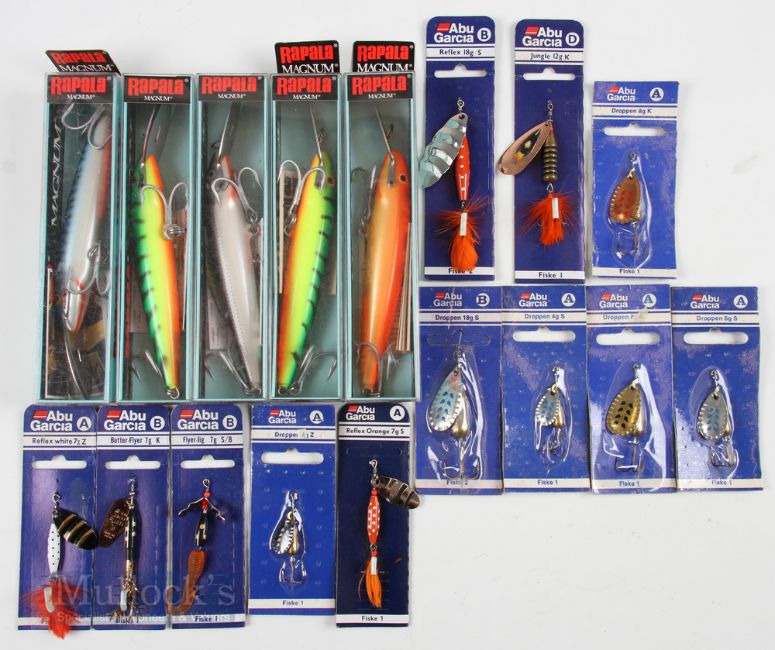 A collection of 17 lures and spinners 5 by Rapala Magnum 14cm sinking lures in assorted colours and 12 ABU Garcia spinners, mainly Droppen and Relex