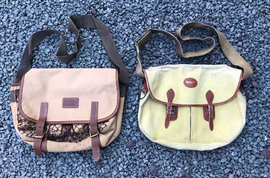 Bob Church, Northampton Canvas and Leather Should Bag with large pocket with detachable line, 2x 7” approx. front pockets, adjustable shoulder strap and net ring, with another similar unnamed bag, both used with no rips or tears (2)