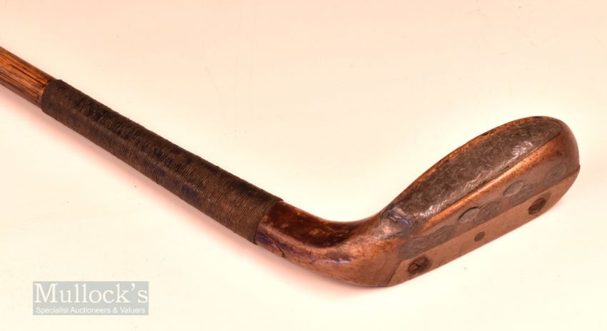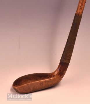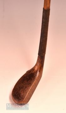 Jack White late longnose scare neck persimmon putter c1905 with added lead sole weighting and fitted with St Andrews bend shaft with period perforated leather grip with under listing. Note From The David Easby Estate