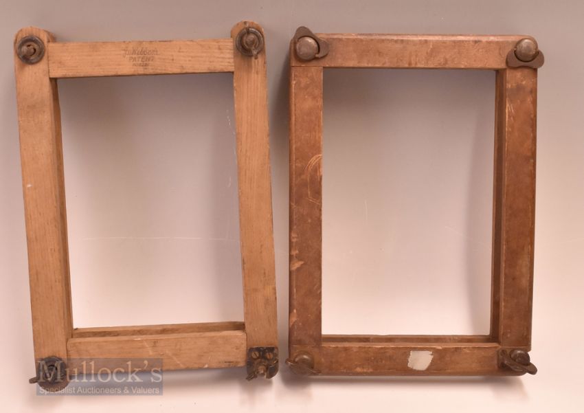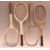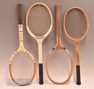 Selection of Wooden Tennis rackets featuring Spalding Jet-Flite Power Model with distress to paint, plus a Falcon fantail wooden tennis racket stamped Sportshouse to side, no strings, a Wisden wooden tennis racket stamped 10 ½, and a Dunlop Alphas wooden tennis racket in white – plus 2x Tennis Racket presses, both square (4)