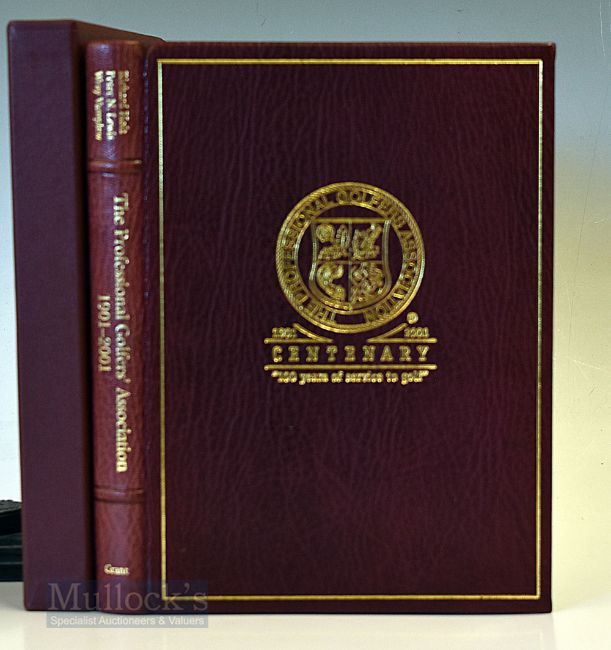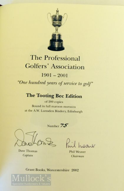 Holt, R, Lewis, P N & Vamplew, Wray (Signed) – ‘1901-2001 Professional Golfer’s Association 100 years of service to Golf’ – Tooting Bec Deluxe edition number 75/200, signed by Dave Thomas and Phil Weaver, bound in morocco leather boards with slipcase – appears in VG condition overall