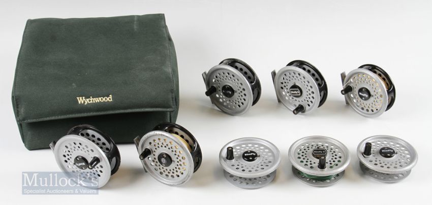 Mixed Reel and Spool Selection – incl Rimfly reels and spools, Leeda 3 ½” and 3 ¼” reel, BFR 3 3/8” reel with spare spool and 2x BFR 3 ½” spools, all housed in green Wychwood bag